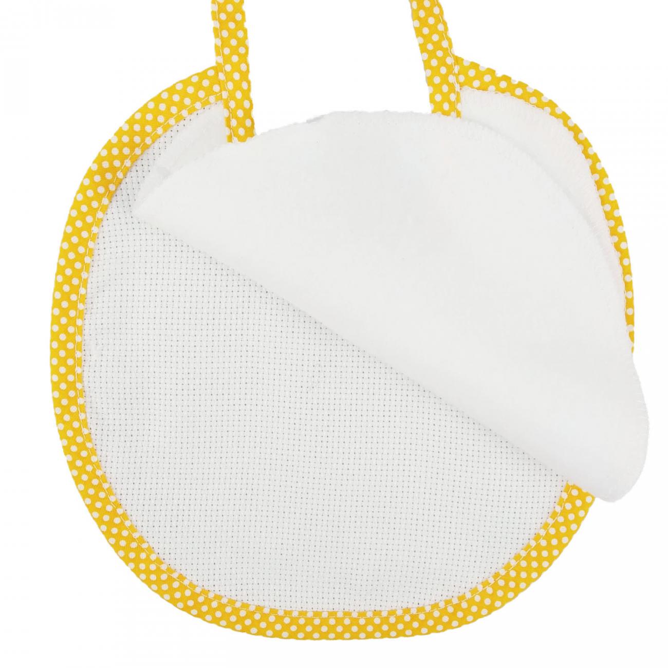 Bavaglino in Tela Ida tutto da ricamare con Lacci , bordato con sbieco a POIS GIALLO .