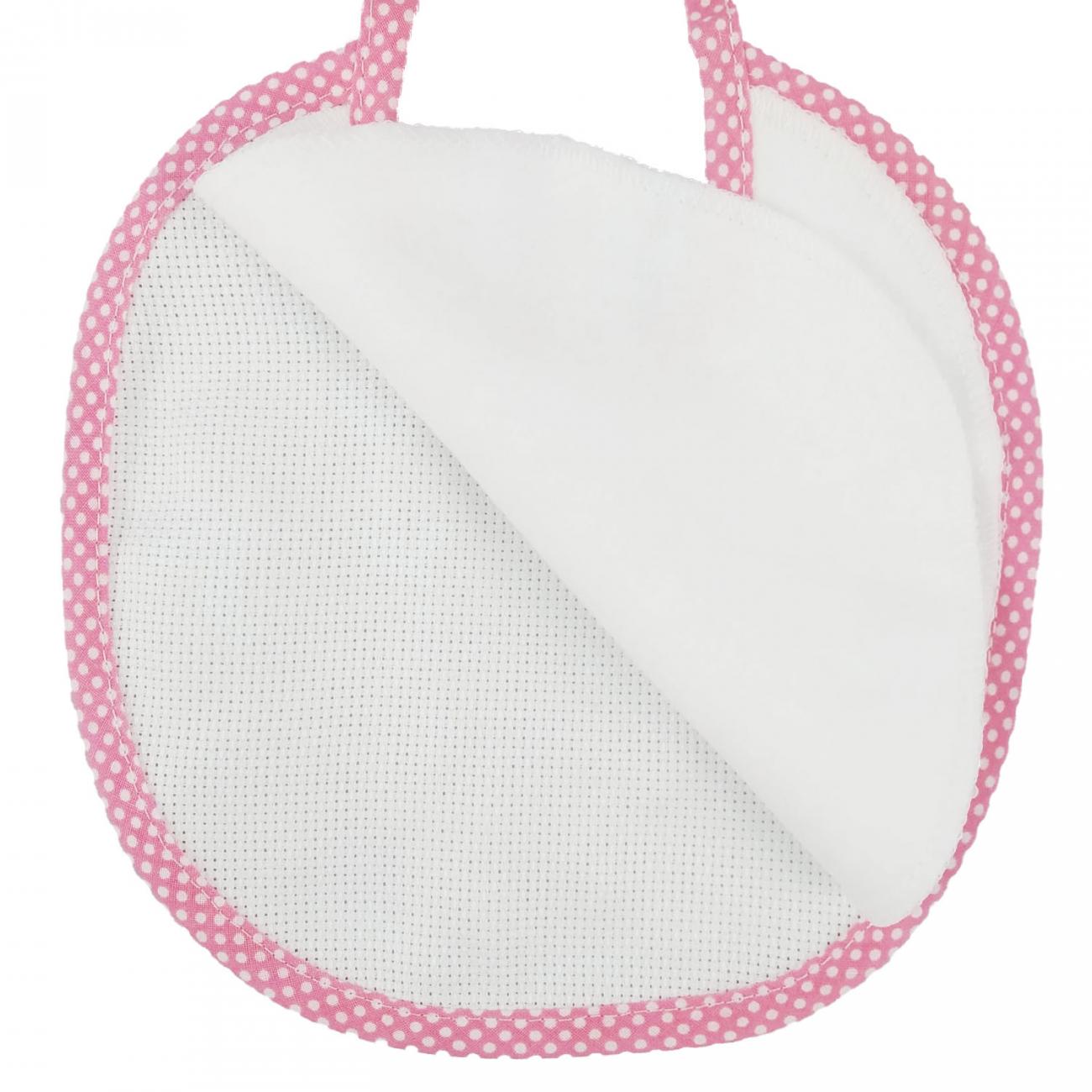 Bavaglino in Tela Ida tutto da ricamare con Lacci , bordato con sbieco a POIS ROSA .