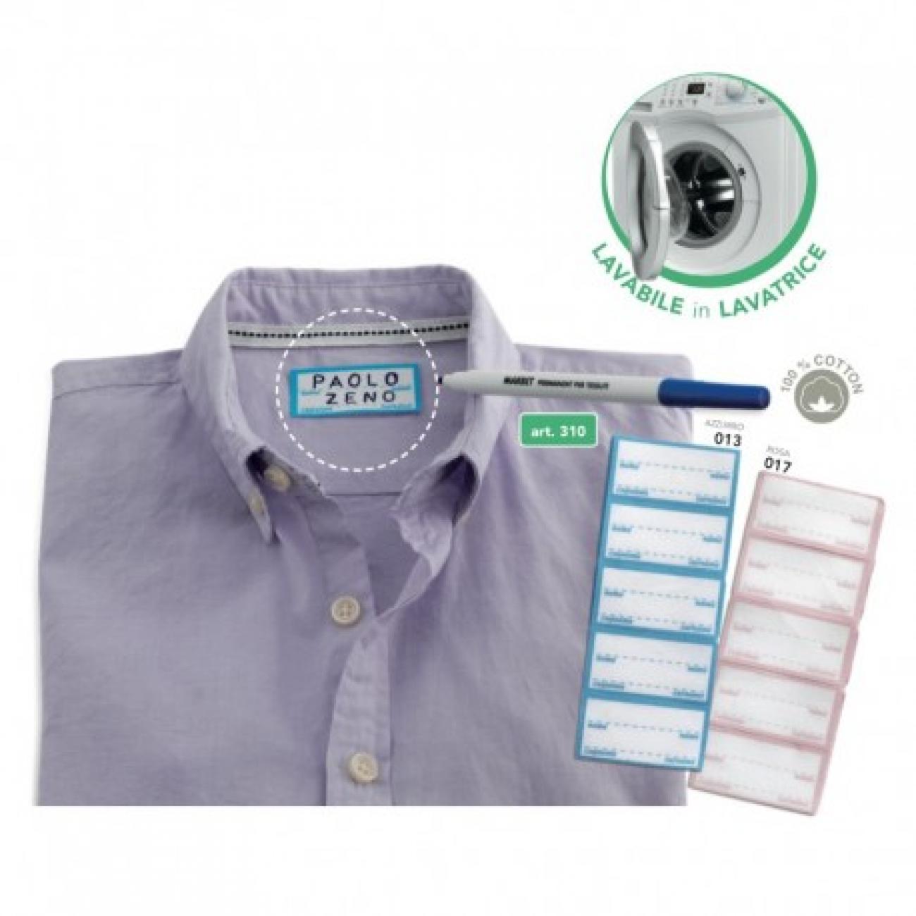 Set per personalizzare indumenti, composto da 15 etichette termoadesive, 1 pennarello e 1 normografo. 100% cotone, lavabili in lavatrice. Colore ROSA
