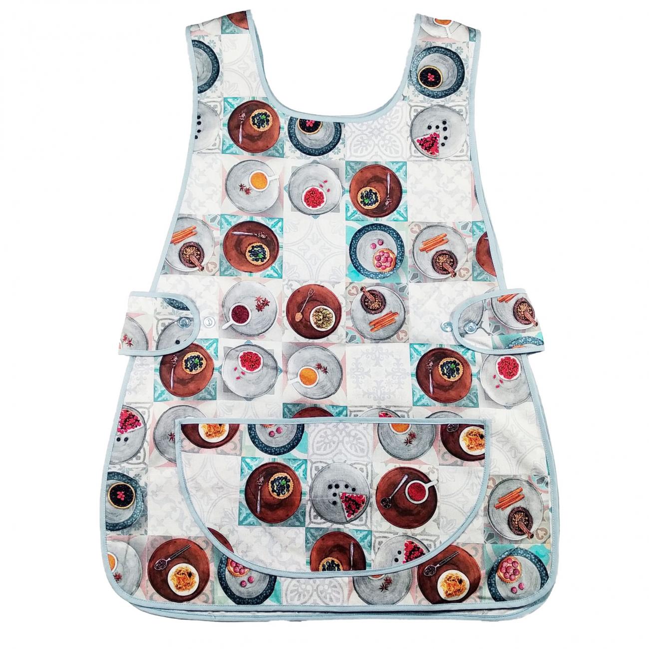 GREMBIULI CASACCA -Elisa- Modello a casacca con parte davanti e parte dietro, molto pratico e comodo. Misura unica con bottoni laterali per regolare la larghezza del grembiule, tessuto in cotone disegnato con tasca centrale MADE IN ITALY 100% cotone